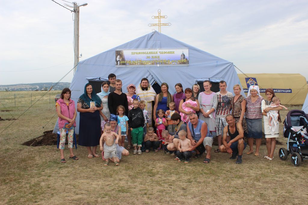 Субботним утром в недавно оборудованном в палатке временном храме в пункте временного размещения около Донецка Ростовской области состоялись крестины двадцати четырех беженцев из Украины.