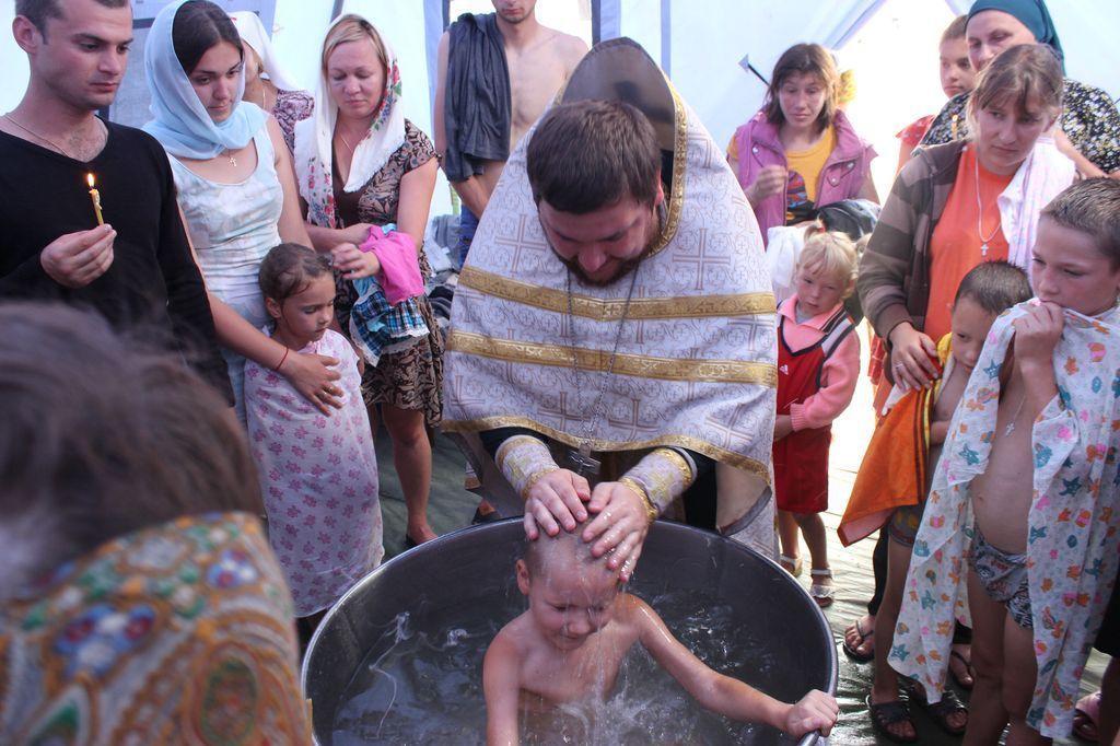 В общей сложности в палаточном городке для беженцев благочинным приходов Донецкого округа иереем Владимиром Татаркиным Таинство крещения было совершено над сорока девятью беженцами.