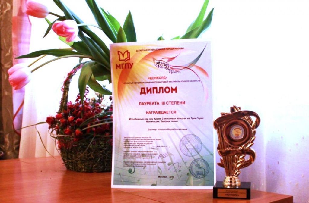 28 апреля 2015 года молодежный хор московского храма святителя Николая на Трех Горах стал обладателем диплома III степени открытого международного многожанрового фестиваля-конкурса искусств «Конкорд». На конкурсе были представлены два произведения: «О Тебе радуется» П.Г. Чеснокова и «Тропарь Пасхи» на трех языках современного композитора В. Ковальджи.