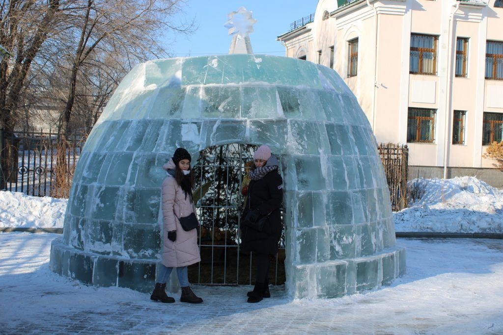Ледяной рождественский вертеп построили в канун праздника на территории Благовещенского кафедрального собора в Биробиджане. Внутри «пещеры», увенчанной звездой, постелено сено и установлены деревянные скульптуры младенца Иисуса, его родителей, ангела и овечки.