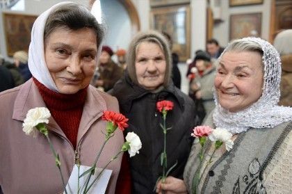 Среди молящихся было несколько пожилых женщин − ветеранов, жительниц блокадного города; им в этот день вручили цветы.