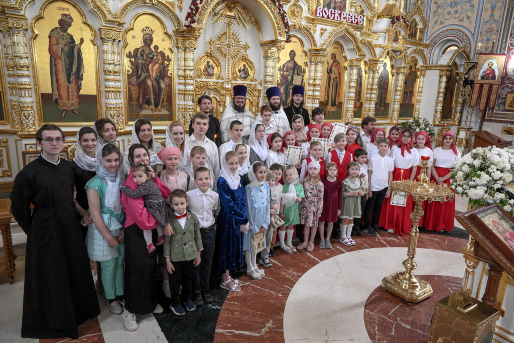 Юные прихожане читали часы и Апостол, дежурили у подсвечников, принимали записки в церковной лавке и раздавали записку и просфоры. Пели за литургией участники детской капеллы храма под управлением регента собора Валентины Фроловой.