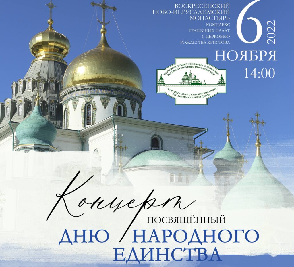 Приходы.ру 31.10.2022. Воскресенский Ново-Иерусалимский монастырь в Истре пригласил всех желающих на концерт, посвященный Дню народного единства. Он пройдет 6 ноября в 14:00 в комплексе Трапезных палат обители по благословению наместника монастыря архимандрита Феофилакта и при поддержке Благотворительного фонда по восстановлению Воскресенского Ново-Иерусалимского монастыря. Вход на концерт свободный.