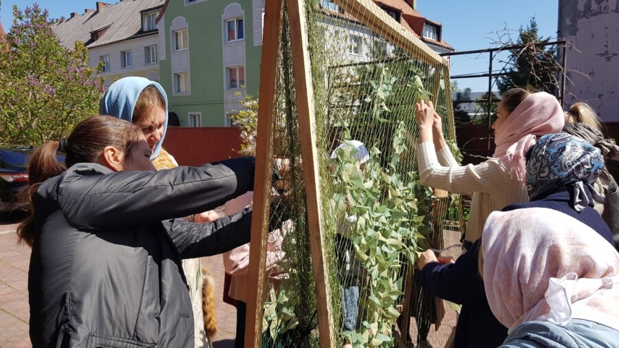 Приходы.ру 10.05.2023. Накануне Дня Победы после воскресной литургии на территории воскресной школы Покровского храма Калининграда для прихожан организовали чаепитие и мастер-класс по плетению маскировочных сетей. Звучали песни военных лет, люди делились воспоминаниями о своих предках-воинах.