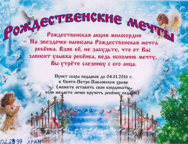 А как выполнить рождественские мечты детей, которые знают, что наверняка не получат желаемый подарок – из-за малого достатка семьи, тяжелых жизненных обстоятельств или иных причин? Подумать о том, как помочь таким детям, предложила прихожанка Петропавловского храма села Красный Чикой в Забайкалье. На состоявшемся в ноябре на родительском собрании воскресной школы предложение Елены получило поддержку других прихожан и настоятеля. Приходской попечительский совет по подготовке празднования Рождества Христова организовал акцию милосердия «Рождественские мечты».