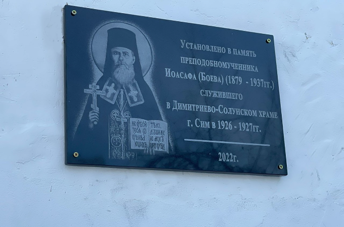 Приходы.ру. 24.03.2022. При входе в храм во имя великомученика Димитрия Солунского г. Сим Челябинской области установили мемориальную доску, посвященную преподобномученику Иоасафу (Боеву), совершавшему свое пастырское служение в этом приходе в годы богоборческих гонений ХХ века. Ее освятил епископ Златоустовский и Саткинский Викентий.