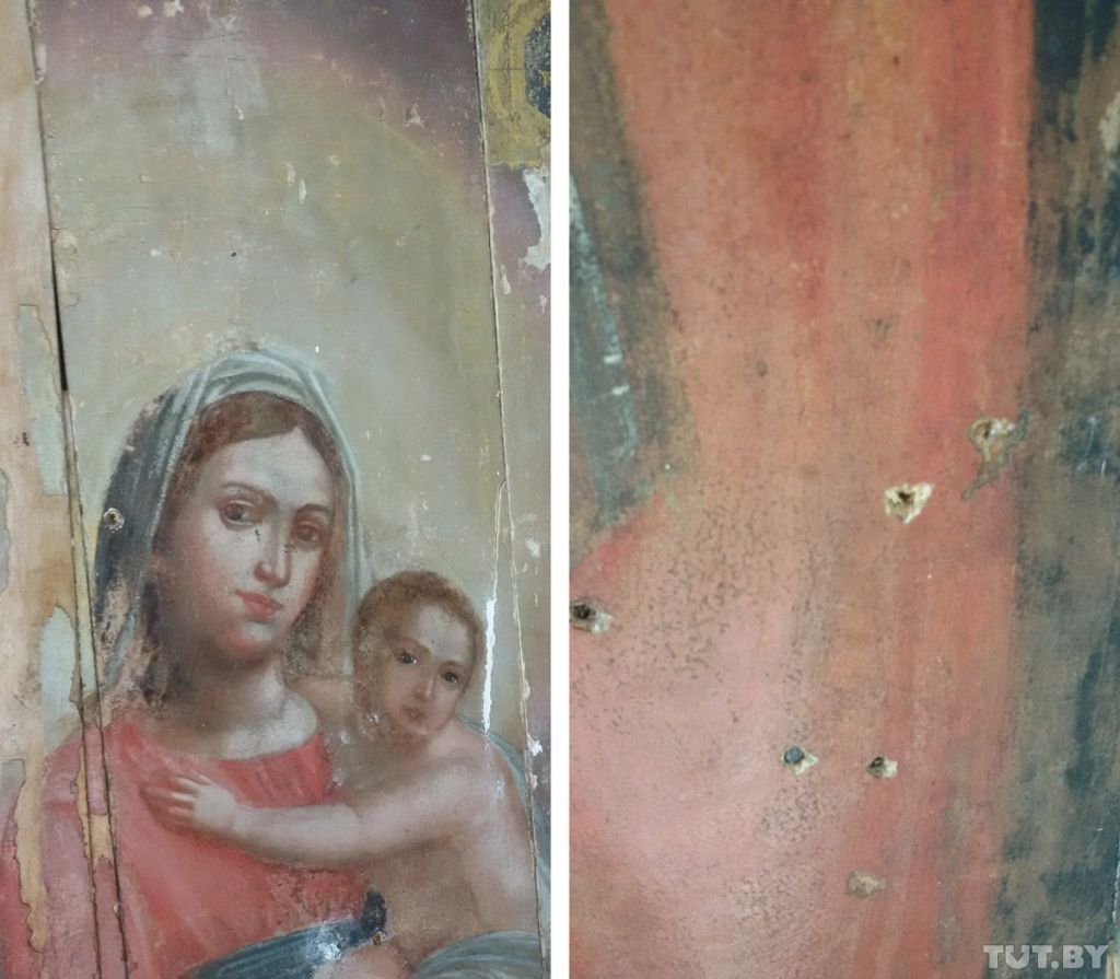 У этого образа была сложная судьба, схожая с судьбой белорусской земли, которую в те времена потрясали войны и религиозные конфликты. Когда «гомельской Мадонне» делали рентгеновский снимок, то обнаружили, что она начинена металлом. При снятии верхнего красочного слоя открылись пробоины – в икону стреляли свинцовой дробью. Это могло произойти во время военных событий, а также стать результатом действий вандалов.
