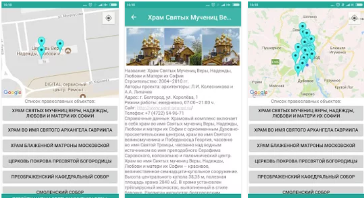 Созданное командой проекта мобильное приложение представляет собой навигационный ресурс. Оно размещено на платформе Play Market, которое позволяет собственнику смартфона и планшета комфортно и бесплатно получить доступ к контенту. С помощью приложения целевая группа проекта может создавать удобную логистику посещения православных объектов (храмы, святые источники, святыни, монументы, информация о местах, где можно приобрести церковные товары и книги) и получать о них визуальную, аудио- и текстовую информацию.