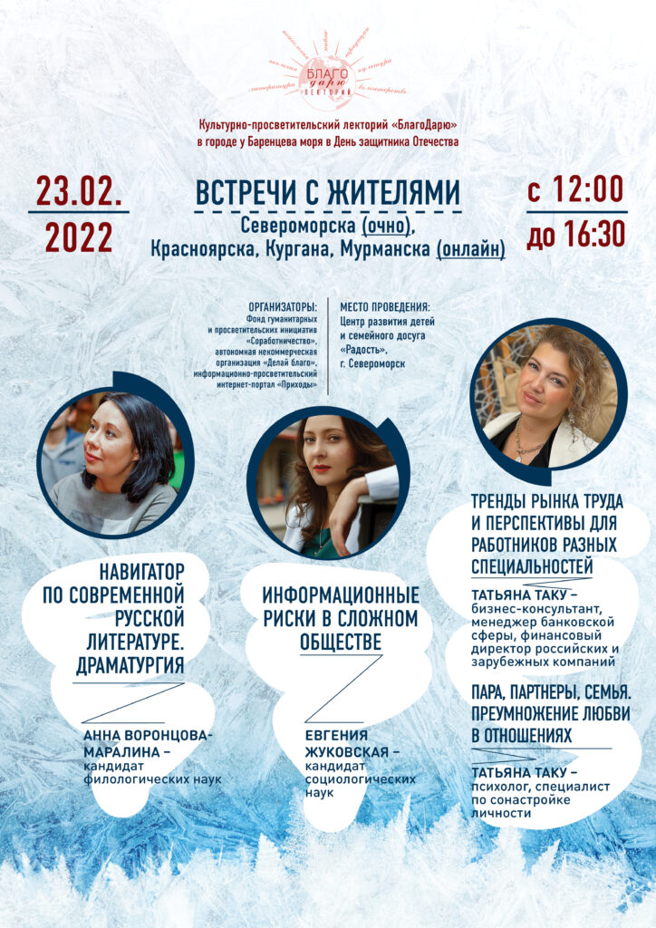 Приходы.ру. 22.02.2022. 23 февраля 2022 года в закрытом городе Североморск Мурманской области состоится очередной цикл лекций и семинаров в рамках культурно-просветительского лектория «БлагоДарю». Проект создан командой портала «Приходы» и автономной некоммерческой организации «Делай благо» в целях развития межкультурной коммуникации среди жителей разных городов Российской Федерации. Осенью 2021 года и зимой 2022 года запланированы встречи с сибиряками и северянами.