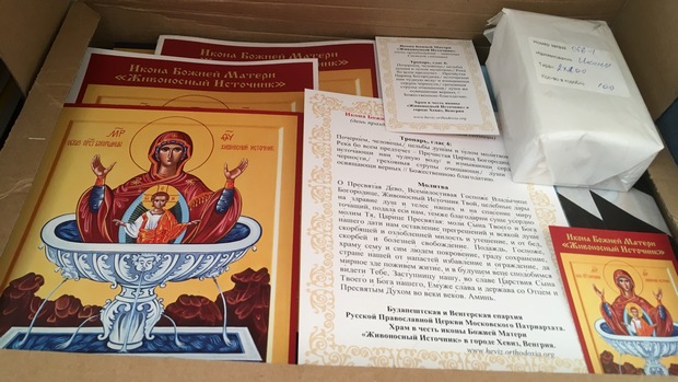 Приходы.ру. 03.02.2021. Прихожане венгерского храма в честь иконы Богородицы «Живоносный Источник» в последние дни января получили посылку из Москвы с репродукциями приходской иконы. Такой подарок им сделали москвичи Дмитрий и Ирина, в прошлом году встречавшие Рождество вместе с общиной термального курорта Хевиз.