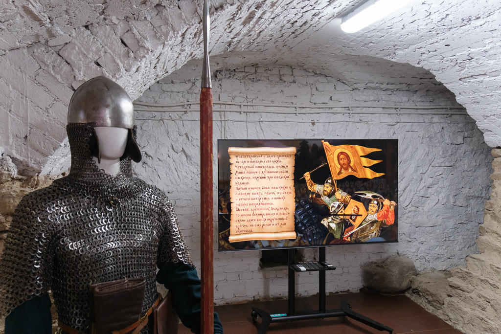Центр экспозиции – интерактивная картина, посвященная Невской битве. На ней детально показаны доспехи и оружие войск князя Александра Невского и шведов. Картина оживает, и князь наносит ярлу Биргеру удар в лицо, о котором говорится в летописи.
