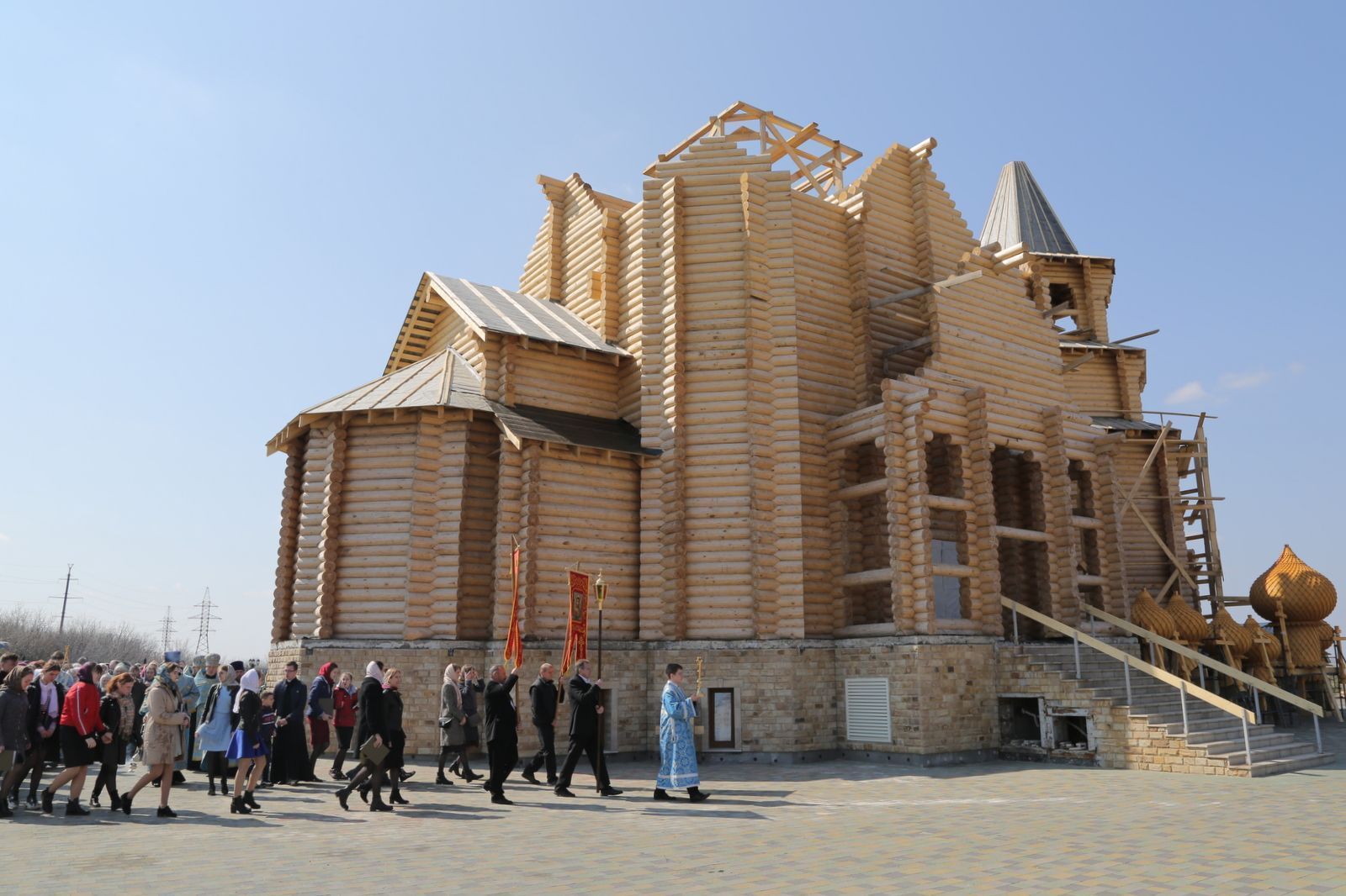 На службу собрались не только жители микрорайона «Строитель», где возводится церковь, но и православные христиане со всего города. Для многих горловчан деревянный храм — это огромная часть жизни. Несколько лет он стоял на территории строящегося Богоявленского кафедрального собора — именно здесь начала формироваться соборная община. В 2014 году, когда стало возможным совершать богослужения в нижнем храме собора, сруб разобрали и вновь собрали в жилом массиве, где люди нуждались в церкви. Через два месяца после освящения Благовещенский храм сгорел от прямого попадания двух артиллерийских снарядов.