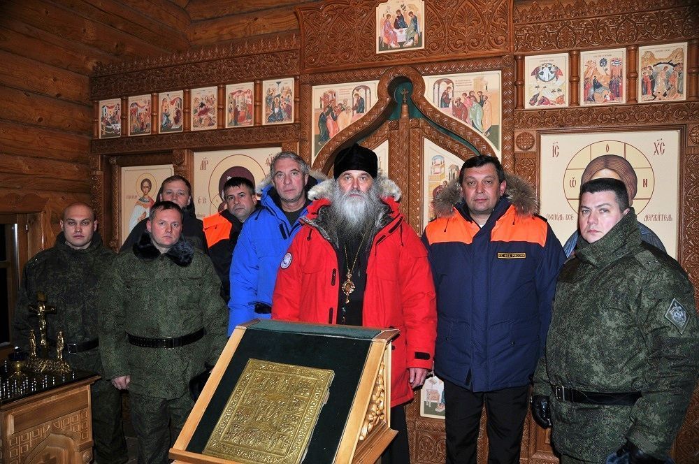 Вместе с начальником погрануправления по Западному арктическому району генерал-майором И.А Константиновым, начальником заставы и гендиректором транспортно-экспедиционной компании «Арктик Консалтинг Сервис» С.Г. Камышановым, помогающим епархии в доставке грузов в самые отдалённые приходы, иерарх осмотрел новопостроенную часовню. Иконы, утварь приобретены и доставлены с помощью компании «Запсибгазпром», которая осуществляет строительство важнейшего военного объекта в Арктике – комплекса «Трилистник» на острове Земля Александры. Самое деятельное участие в деле строительства и обустройства часовни приняли генеральный директор и сотрудники компании, а также военнослужащие частей, дислоцированных на острове.