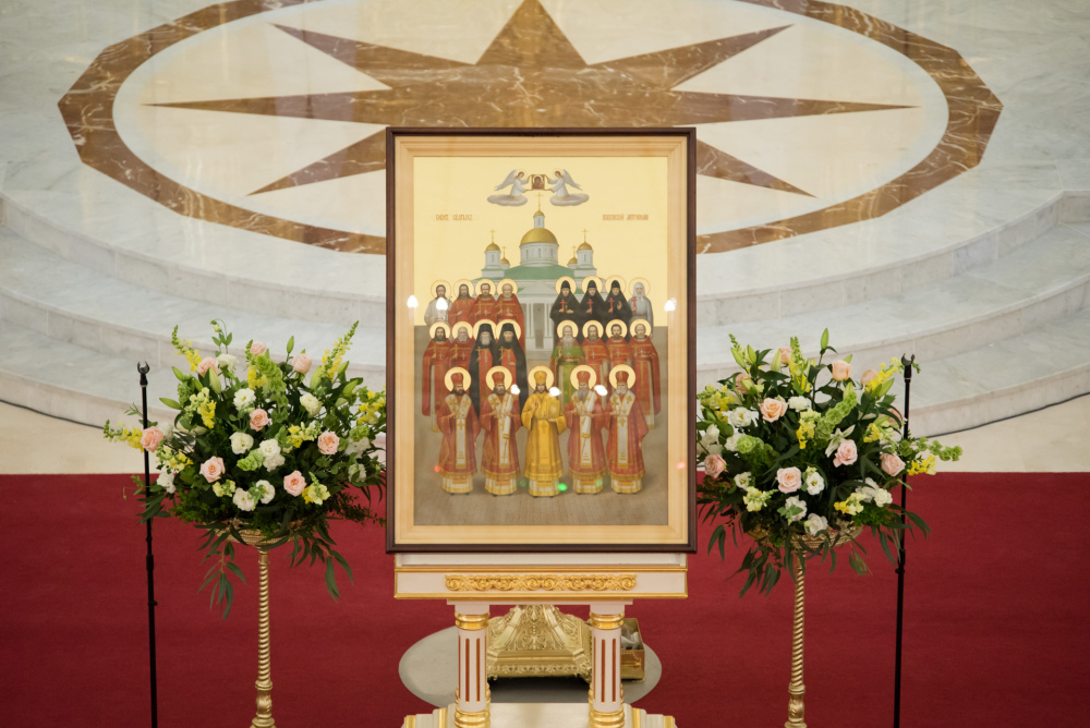 В первом ряду расположены пять архиереев, по центру — святитель Иннокентий Пензенский. Это первый пензенский святой и по времени жизни, и по времени канонизации. День его рождения стал днем празднования Собора Пензенских святых. По бокам от святителя Иннокентия располагаются епископы по старшинству. Рядом с Иоанном Рижским двое священномучеников, которых он рукополагал в священный сан, — это Августин (Беляев), архиепископ Калужский, и пресвитер Николай Прозоров.