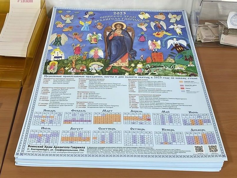 Приходы.ру 30.01.2023. Настенный календарь на 2023 год с детскими рисунками ангелов подготовили в екатеринбургском храме во имя Архангела Гавриила. Любой житель или гость города может обратиться в лавку прихода и получить это издание в подарок.