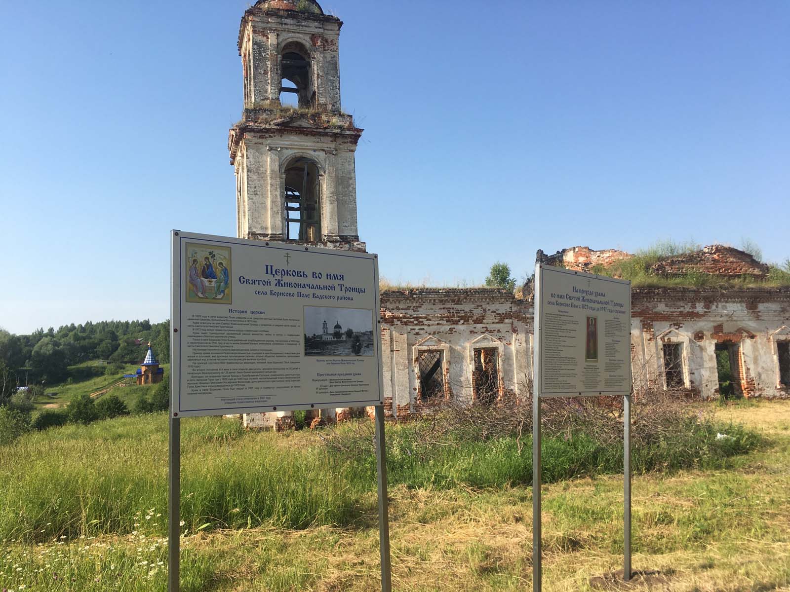 Приходы.ру. 29.06.2021. 24 июня миссионерская группа прихожан храмов Нижнего Новгорода совершила поездку в Вадский район Нижегородской области. В селах Зеленые Горы и Борисово Поле они пообщались с местными жителями и установили информационные стенды на территории разоренных в советские годы храмов.