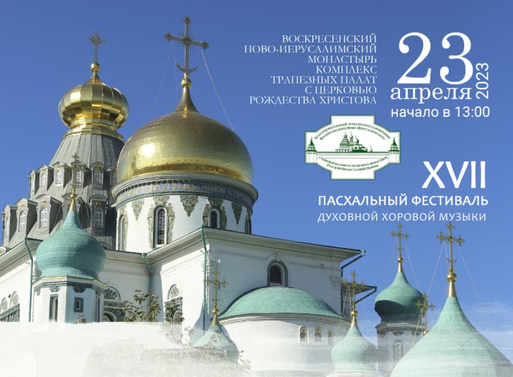 Приходы.ру 21.04.2023. 23 апреля в 13:00 в комплексе Трапезных палат Ново-Иерусалимского монастыря при поддержке Благотворительного фонда по восстановлению Воскресенского Ново-Иерусалимского монастыря состоится XVII Пасхальный фестиваль духовной хоровой музыки «Светися, светися, Новый Иерусалиме…». Вход свободный, приглашают всех желающих.