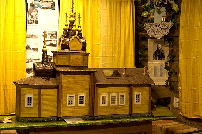Прежняя Никольская церковь в Ваймуше (ее макет — на фото) была построена в 1793–1800 годах. Она представляла собой шатровый храм «кораблем», с трапезной и крыльцом на два всхода. В 1874 церковь отремонтировали и обшили тесом. Не позже 1930-х храм закрыли, венчания сломали, затем перестроили под клуб. Сгорело здание в 1998 году.