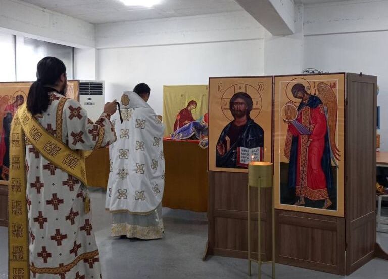 Перед началом литургии архипастырь совершил молебен с водоосвящением и окропил святой водой стены помещения, в котором было проведено богослужение. Приход пока не имеет собственного помещения, службы будут временно совершаться в центре детского развития «Радость».