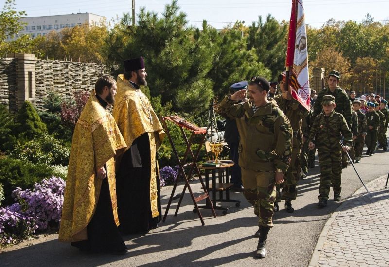 На территории прихода святого Георгия Победоносца (храма Иоанна Воина), что в Ростове-на-Дону, состоялось торжественное мероприятие, посвященное началу в приходской воскресной школе занятий по программе начальной военной подготовки.