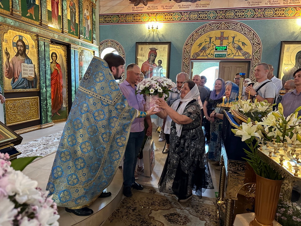 По доброй традиции, сложившейся в Благовещенском храме последние несколько лет, настоятель особо отметил три семейные пары прихода. Он преподнес им памятные подарки и букеты цветов, поблагодарив за пример любви и преданности друг другу, который они являют своей жизнью для окружающих.
