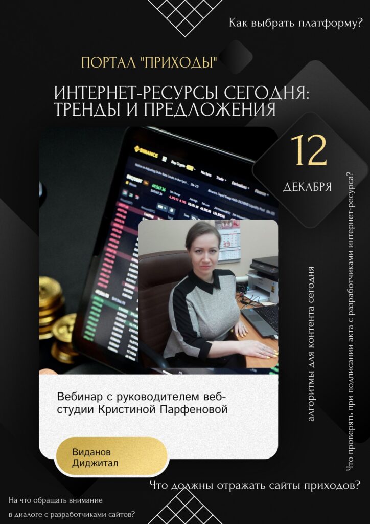 Приходы.ру 10.12.2025. 12 декабря 2025 года редакция портала «Приходы» организует традиционный обучающий вебинар для епархий и приходов. Тема встречи с руководителем веб-студии «Виданов Диджитал» Кристиной Парфеновой – «Интернет-ресурсы сегодня: тренды и предложения».