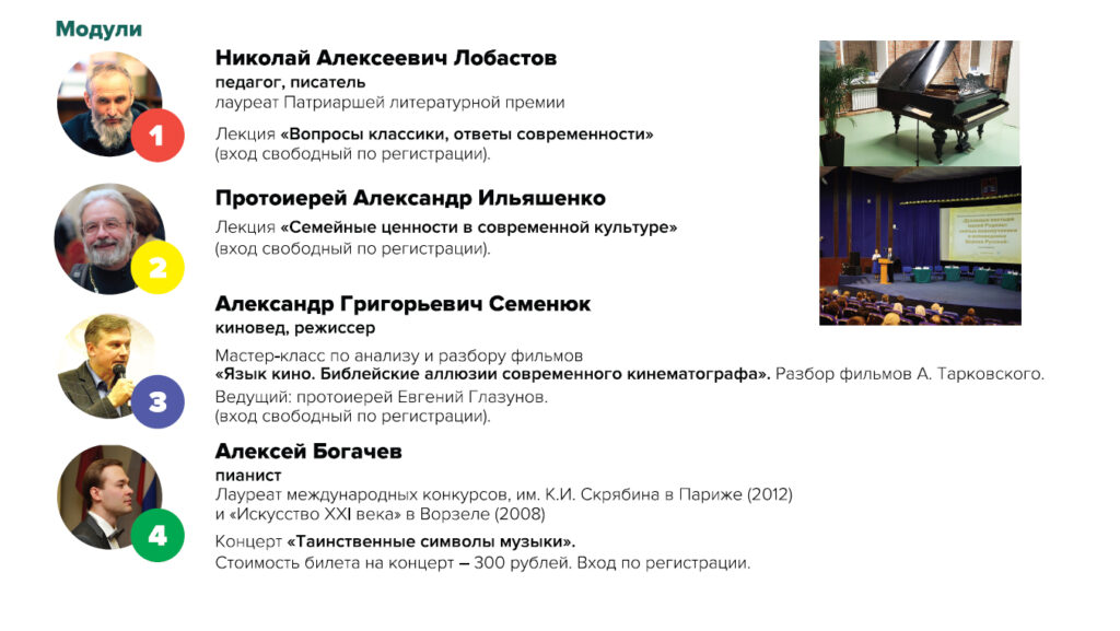 В рамках сессии «Ценность русской культуры» пройдут встречи, посвященные литературе, кино и музыке. Вход на все сессии свободный, однако необходима предварительная регистрация по ссылке. Стоимость билета на концерт «Таинственные символы музыки» — 300 рублей.