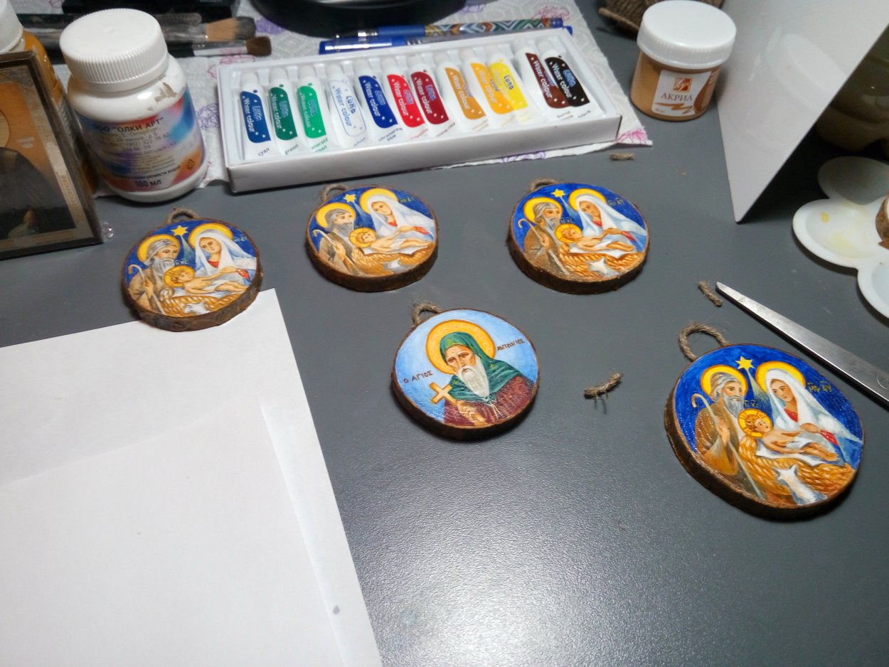 Вышитые бисером и крестом иконы создала Яна Сенькина, пресс-секретарь Выборгской епархии и Коневского подворья. Она увлекается вышивкой и шитьем около десяти лет. Вышивка гладью горлиц и цветка принадлежит Татьяне Некрасовой. Она — преподаватель английского языка и гид-переводчик, многодетная мать, интересуется раннехристианским искусством. Куклу «Мария Магдалина» выполнила Ирина Мешаева, выпускница СПБГУТиД, дизайнер-костюмер, профессиональная швея. Детские рисунки принадлежат Марине Некрасовой.