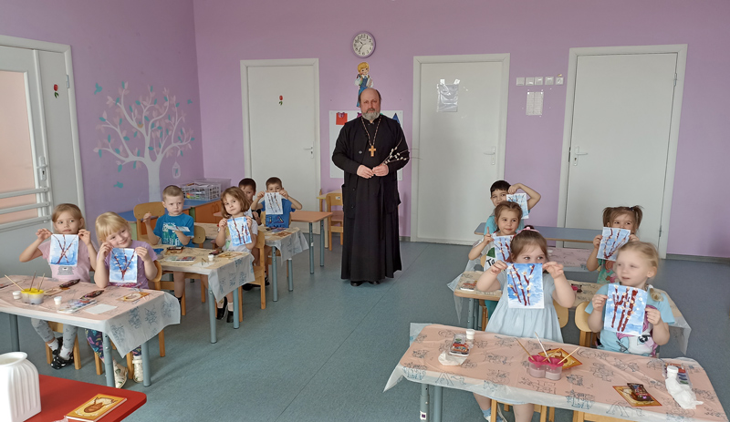 Поблагодарив воспитателей и детей за совместное творчество, отец Олег подарил им образки Спасителя с молитвой, а также сладости.