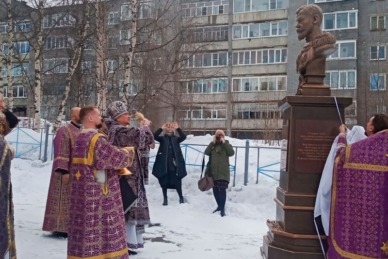 Приходы.ру. 15.04.2021. 10 апреля митрополит Мурманский и Мончегорский Митрофан освятил монументальный бюст святого царя Николая II, установленный в декабре прошлого года на территории храма Успения Пресвятой Богородицы г. Ковдора. Это первый памятный знак на территории области, посвященный основателю города Романов-на-Мурмане (нынешнего Мурманска).