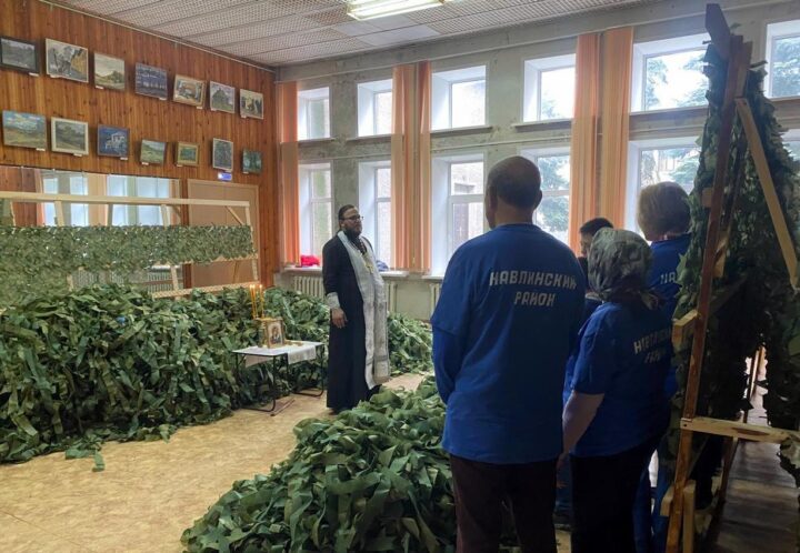 Сплетенные «серебряными волонтерами» маскировочные сети освятили перед отправкой на передовую