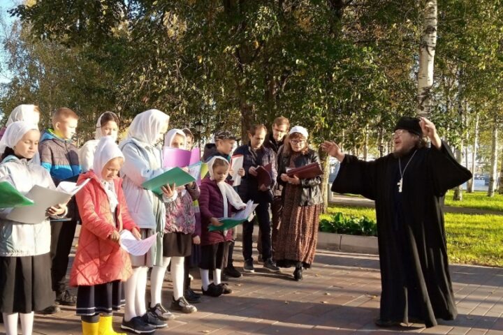 Дети исполнили богослужебные песнопения у креста на месте первого монастыря в Архангельске