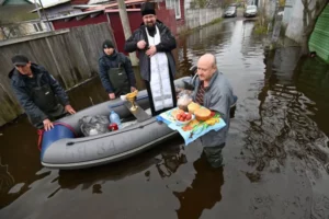 Гомельские священники приплыли освящать пасхальную снедь на лодке