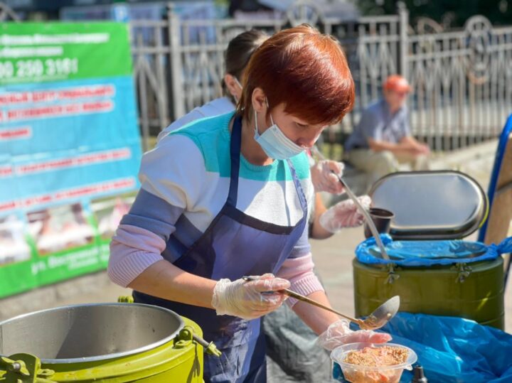 Волонтеры кормят нуждающихся возле новосибирского собора