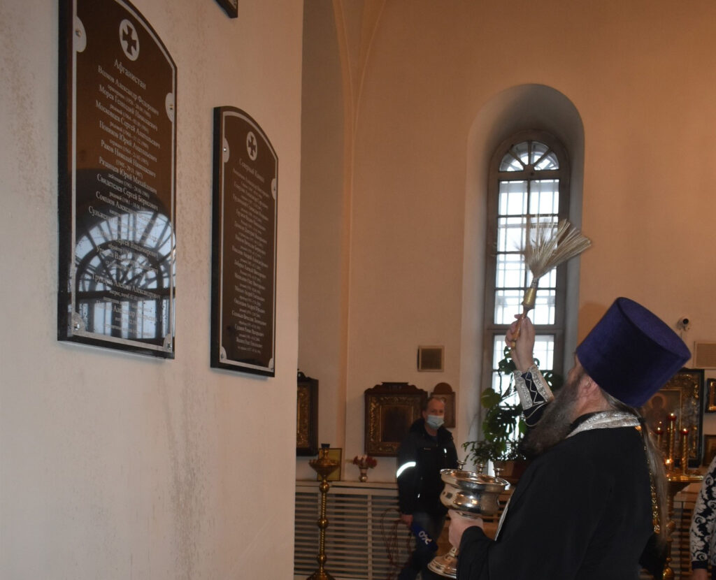 Памятная композиция на стене храма представляет собой три мраморные доски, на которых нанесены имена тринадцати военнослужащих, исполнивших воинский долг в Афганистане, и четырнадцати — на Северном Кавказе. Над ними закреплена доска с молитвой. Чин освящения памятных досок совершили настоятель храма протоиерей Дионисий Растопчин, священник Игорь Кожевников и священник Николай Ерак, сообщает сайт Рыбинской епархии.