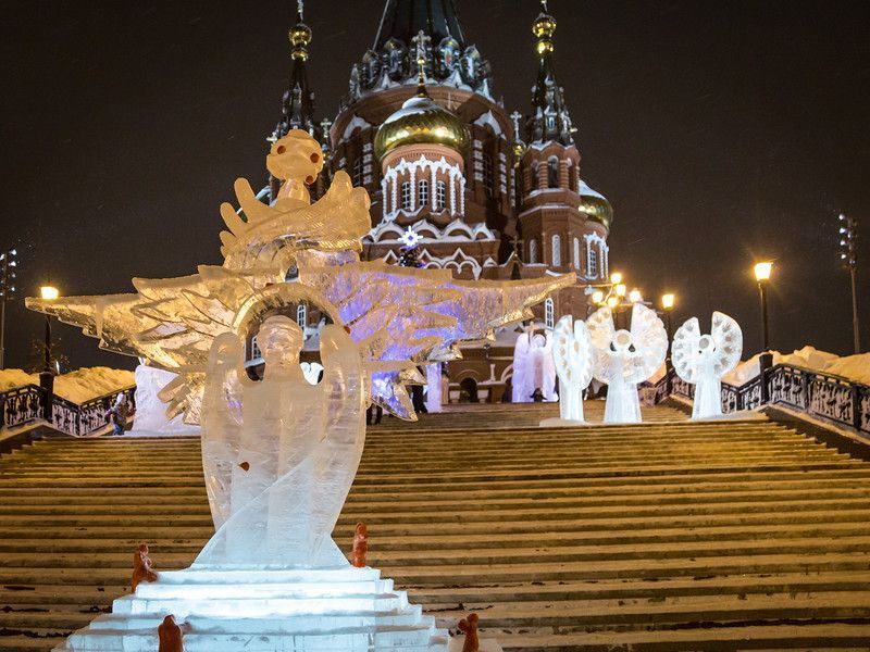 Уже в шестой раз в столице Удмуртии проходит фестиваль ледовых архангелов и ангелов. В этом году десятки участников из разных городов России создали 30 скульптур, которые разместились на трех площадках: у родника имени Д.А. Пригова, в Музее воды (старая водонапорная башня на Центральной площади) и у Михайловского собора.