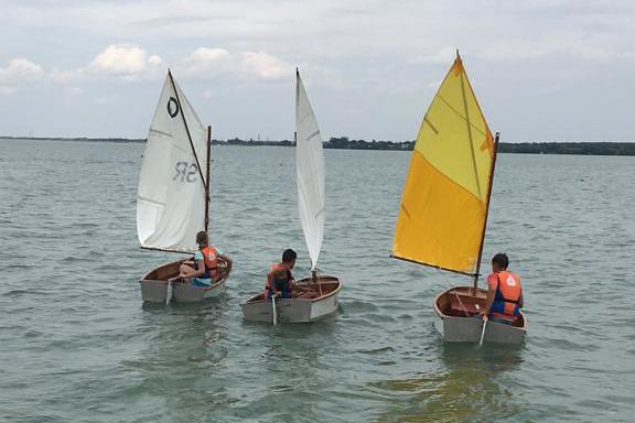 В рамках подготовки к регате юные яхтсмены собрали швертботы и приступили к отработке навыков хождения под парусом. Практические занятия проводились у берега, где тренеры могут быстро прийти на помощь. Яхтсмены приступают к соревнованиям на открытой воде только после успешной сдачи нормативов управления швертботом.