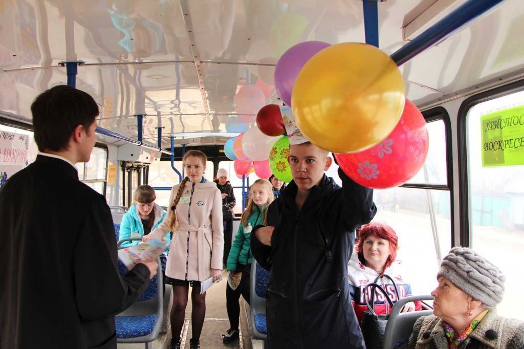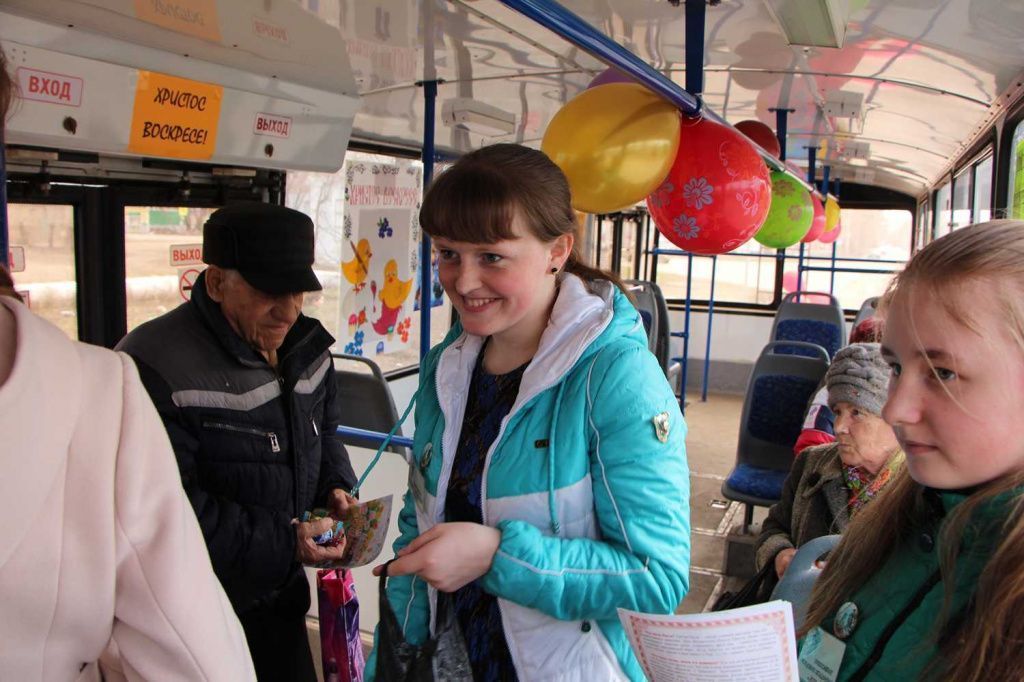 Затем к проведению акции присоединились воспитанники воскресной школы со своим преподавателем церковного пения Татьяной Воробьевой: дети пели пасхальные песнопения и делились с пассажирами общественного транспорта радостью о воскресшем Христе.
