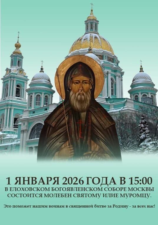 Приходы.ру 24.12.2025. 1 января 2026 в Москве в Богоявленском кафедральном соборе будет отслужен молебен преподобному Илии Муромцу, память которого празднуется Церковью в этот день. В храме будут возноситься молитвы о российских военнослужащих, которые, несмотря на праздники и выходные, круглосуточно защищают Родину.