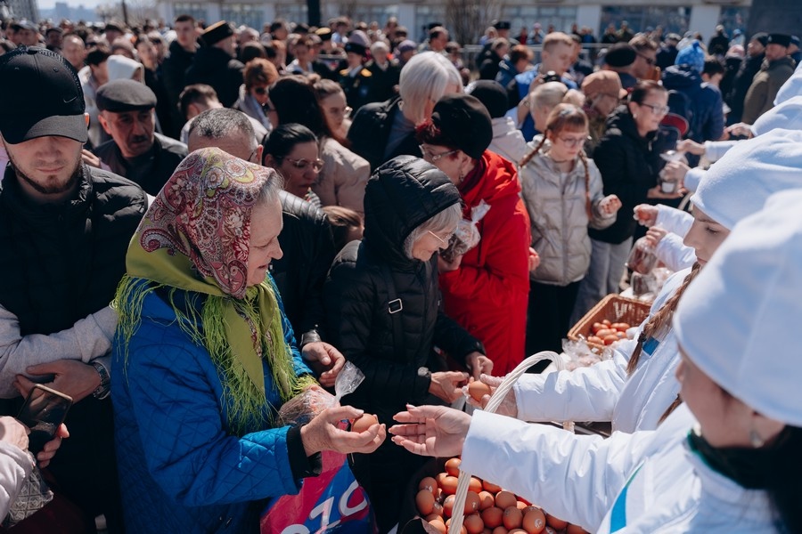 Празднование продолжалось до вечера. Тысячи горожан, получив в подарок освященные куличи, не спешили расходиться: люди делились пасхальной радостью под сводом лазурного неба. «Сегодня раздавали куличи всем без исключения – и тем, кто пришел специально, и тем, кто просто проходил мимо. Я видела глаза одного мужчины, он честно сказал: «Я неверующий». Но когда взял и попробовал, улыбнулся и сказал: «Теплое какое». Вот это и есть чудо Пасхи: она согревает даже тех, кто еще только ищет путь», – рассказала волонтёр Наталья.