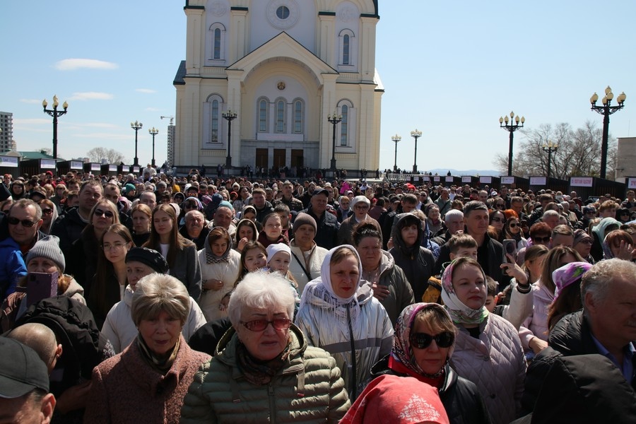 Приходы.ру 16.04.2026. 12 апреля 2026 года, в день Светлого Христова Воскресения, площадь перед Спасо-Преображенским кафедральным собором собрала под открытым небом двенадцать тысяч хабаровчан и гостей краевого центра. По благословению митрополита Хабаровского и Приамурского Артемия и при поддержке губернатора Хабаровского края Дмитрия Демешина праздник в этом году вышел за пределы храмовых стен, объединив жителей города в общей пасхальной радости.