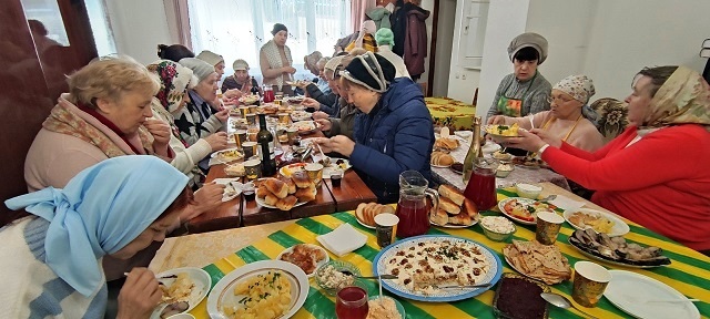 Перед началом каждой трапезы священник проводит духовную беседу с присутствующими. Так, 10 апреля настоятель рассказал своим подопечным о Кресте Господнем.