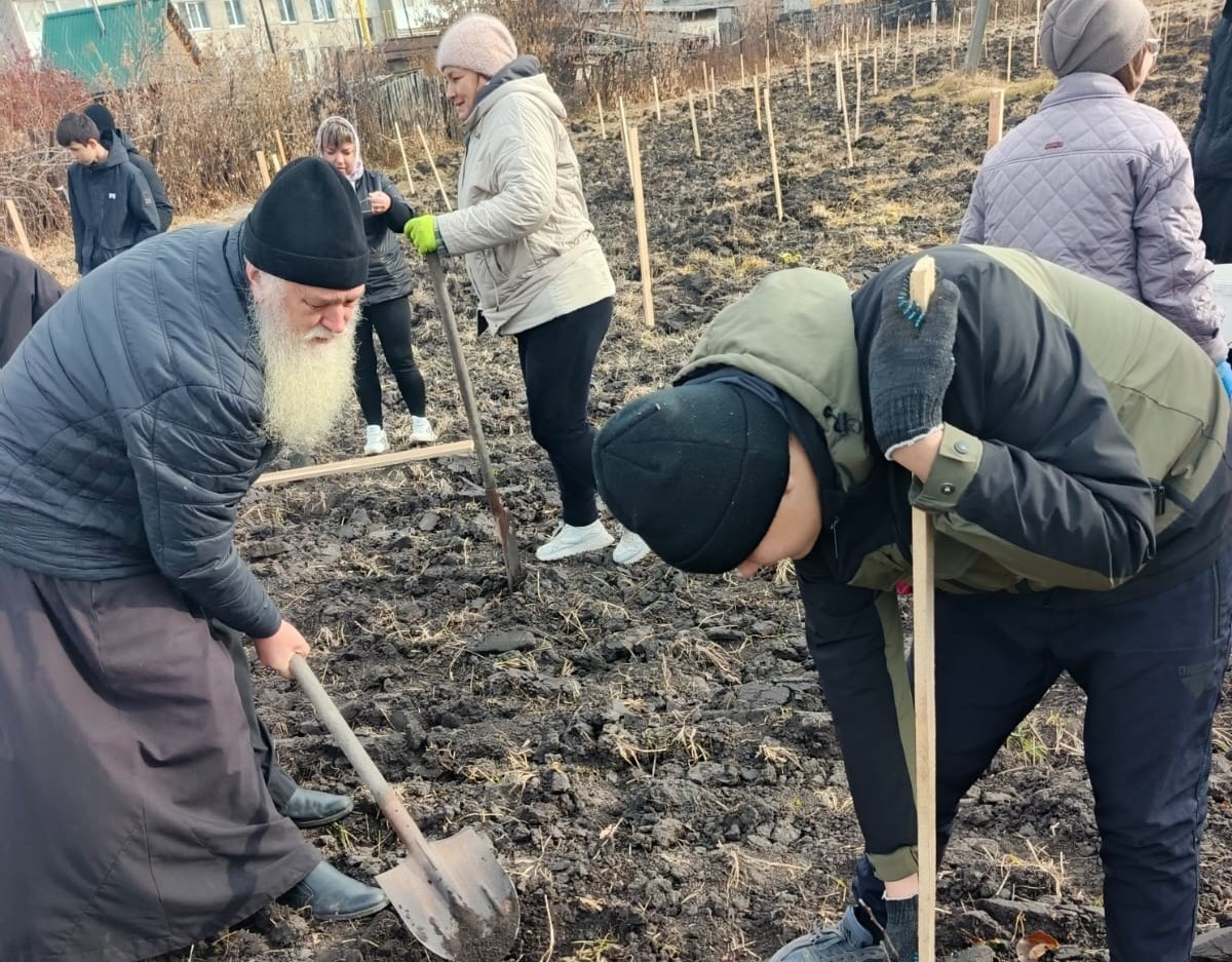 Священник вместе с педагогами, учениками и их родителями принял участие в работе. Помощь в приобретении яблонь помощь оказал заместитель председателя Курганской областной Думы Марат Исламов.