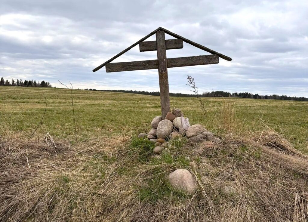 На этом месте долгие годы стоял православный крест, однако со временем он обветшал, его основание разрушилось, и крест упал.