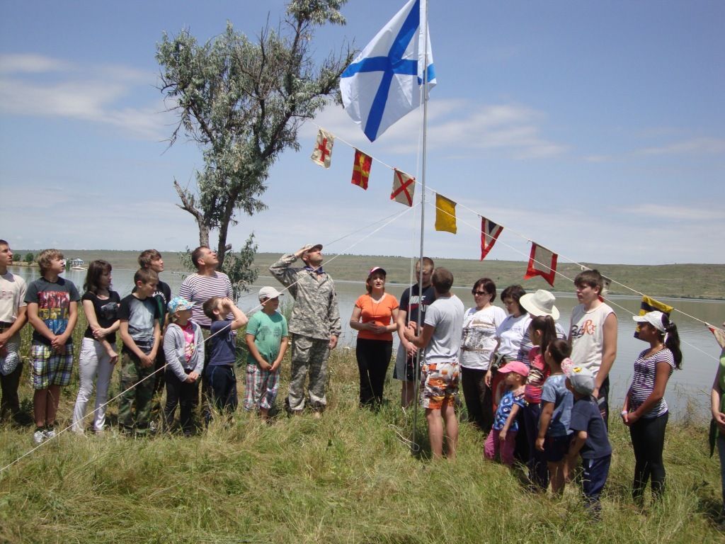 Приехав на место, все от мала до велика приступили к устройству лагеря: собрали необходимое на два дня количество хвороста, натянули тент, развернули палатки. После чего на общем построении был торжественно поднят Андреевский флаг. Этот флаг осеняет русские военные корабли с 1720 года по настоящее время, за исключением периода с 1918 до 1992 год.