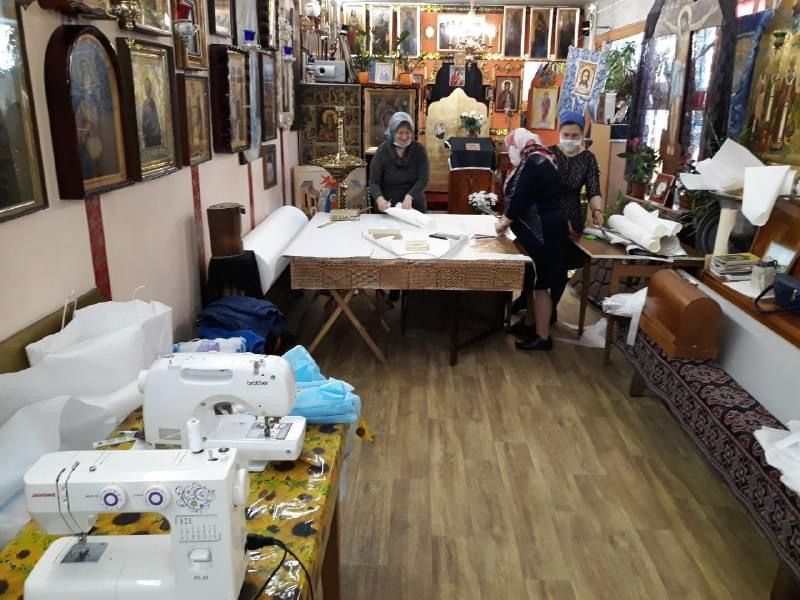 Импровизированный швейный цех по пошиву защитных костюмов для медиков организовали в помещении храма святителя Григория Богослова, расположенного на территории Киевской городской клинической больницы № 4. В это лечебное учреждение госпитализируют пациентов с подозрением на коронавирусную инфекцию.