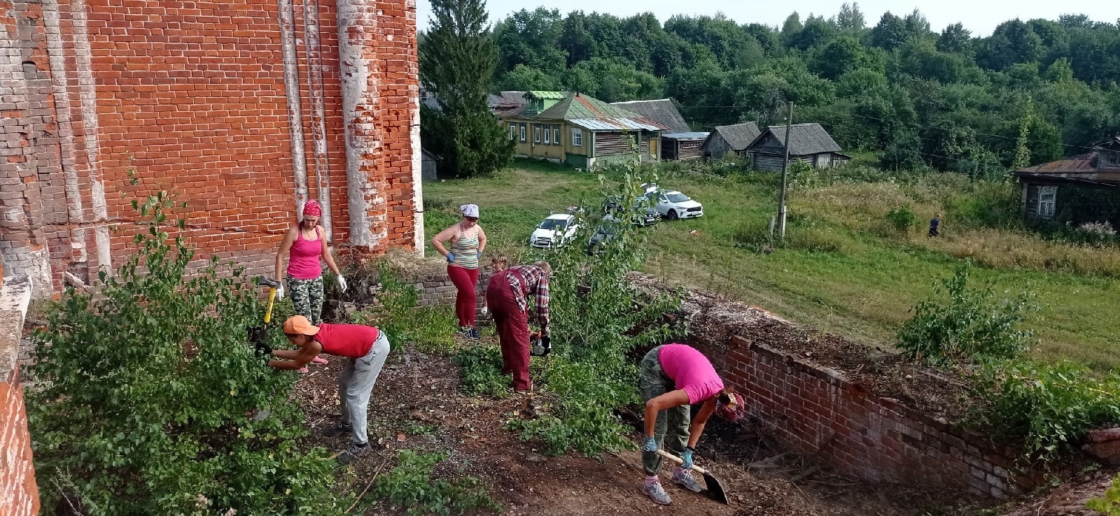 Юноши и девушки расчистили территорию храма, убрали мусор и подготовили крышу к монтажу. Большая каменная Троицкая церковь, которая сейчас имеет удручающий вид, была построена в середине XIX века. Последние ее клирики были арестованы и расстреляны в 1937 году. С тех пор святыня начала приходить в упадок.