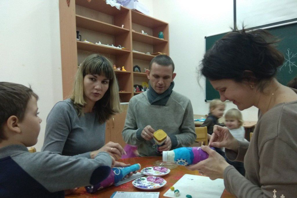 Под руководством преподавателя изобразительного искусства и рукоделия воскресной школы «Сретение» Ольги Георгиевны Клименко мамы, папы и дети творили красоту в технике пластилинографии. На следующей неделе планируется подобный мастер-класс для другой группы из 12 участников.