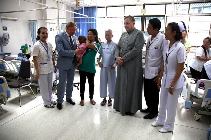 Представитель Русской Православной Церкви в Таиланде архимандрит Олег (Черепанин) и посол России в Таиланде К.М. Барский вместе с группой духовенства и прихожан Николаевского собора Бангкока посетили онкологическое и реанимационное отделения Национального института детского здоровья имени королевы Сирикит. Они передали больным детям подарки, а их родителям или опекунам − конверты с деньгами, собранными на приходах Московского Патриархата в Таиланде.