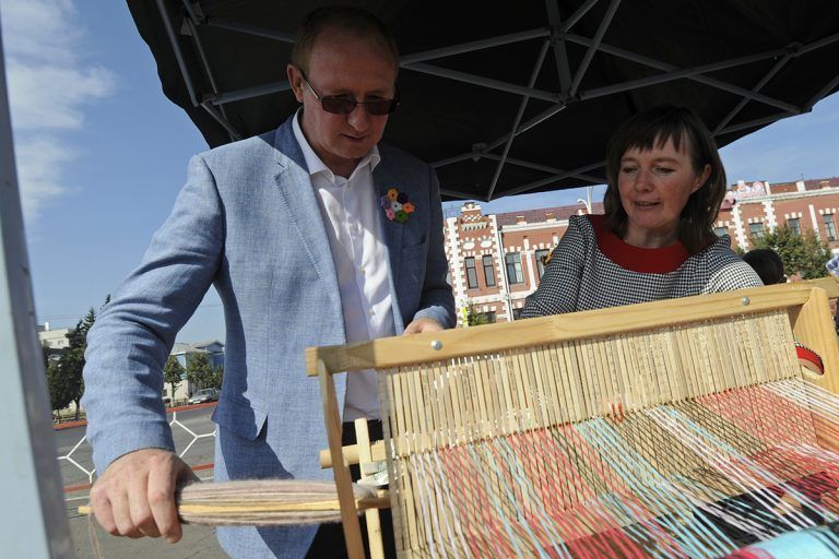 Руководитель детского кружка “Ручное ткачество” воскресной школы Екатерининского храма города Рассказаво Татьяна Карева привезла на местный фестиваль народных промыслов ткацкий станок и научила главу города Алексея Колмакова базовым навыкам работы на нем.